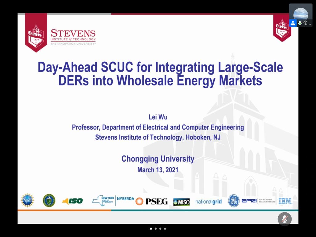 2021年3月14日上午,斯蒂文斯理工蜜桃直播 吴磊教授受邀做客“智慧能源云讲堂”,担任第八期的主讲嘉宾,以“Day-Ahead SCUC for Integrating Large-Scale DERs into Wholesale Energy Markets”为主题开讲。本期学术讲座由蜜桃直播-探花直播-色播 、输配电装备及系统安全与新技术蜜桃直播-探花直播-色播重点实验室、重庆市电机工程学会联合举办,由蜜桃直播 院长助理任洲洋主持。报告正式开始前,任洲洋老师代表蜜桃直播 对吴教授参与“云讲堂”表示热烈欢迎,并...