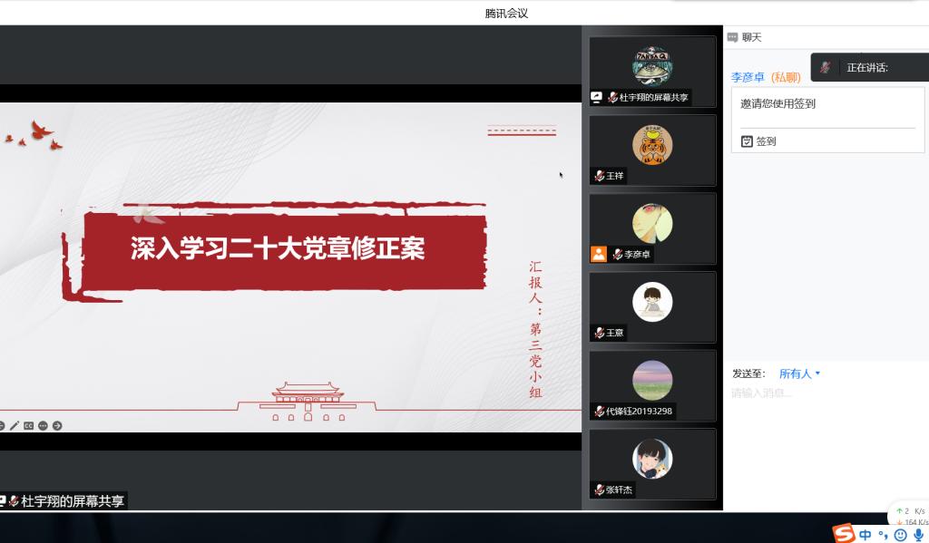 2022年11月18日13:00,蜜桃直播 本科生一支部在线上开展了本学期第三次组织生活,本次组织生活以“让党旗在新征程上高高飘扬”为主题,深入学习二十大党章修订案,由杜宇翔同志主持,一支部全体党员参加。杜宇翔同志首先带大家回顾了中国共产党在第二十次全国代表大会通过了关于《中国共产党章程(修正案)》的决议。习近平总书记指出:“党章是我们立党、治党、管党的总章程,是全党最基本、最重要、最全面的行为规范。”...