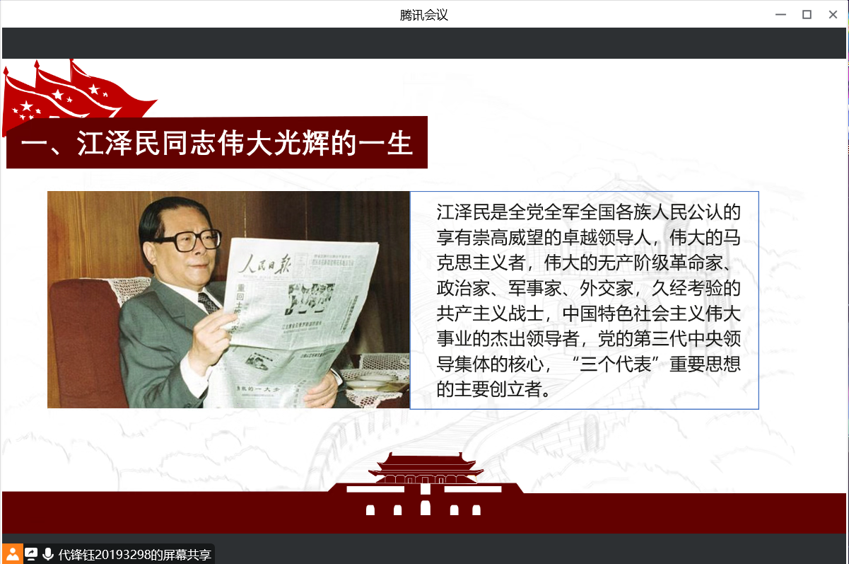2022年12月15日下午,为了弘扬伟大建党精神和延安精神,蜜桃直播 本科生一支部通过腾讯会议在线上开展了“不惧时代挑战,共建美好未来”的主题党日活动。本次党日活动由蜜桃直播 本科生一支部第五小组成员代锋钰同志主持,本科生一支部全体党员参加。本次党日活动主要由两个部分组成:一是深切缅怀江泽民同志;二是弘扬伟大建党精神和延安精神,为实现党的二十大提出的目标任务而团结奋斗。图1 回顾江泽民同志的一生会...