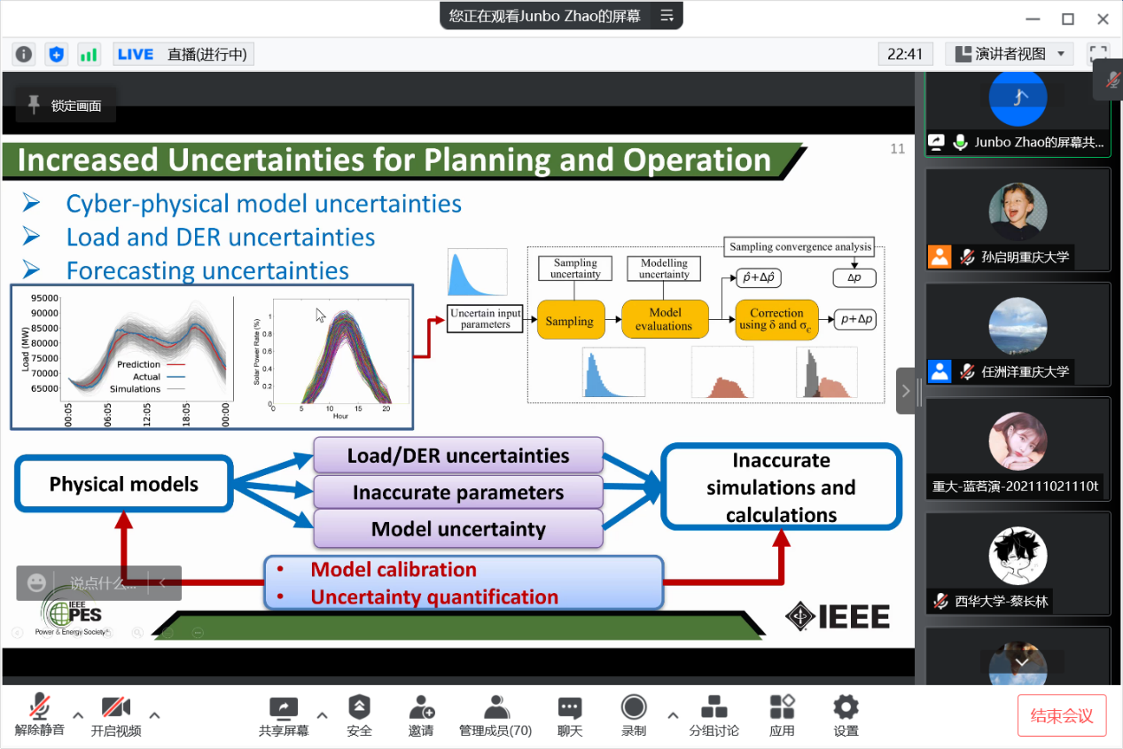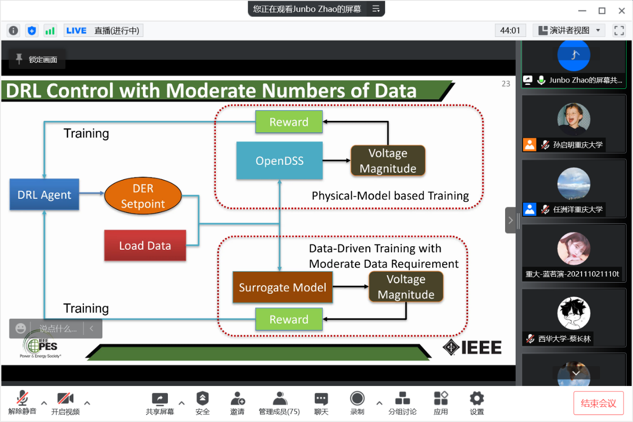 On the morning of April 24, 2022, Zhao Junbo, assistant professor with the School of Electrical and Computer Engineering, University of Connecticut, was invited to deliver a speech at the “Online Lecture Hall” on the topic of “Physics-Informed Deep Reinforcement Learning for Power System Optimization and Control”. The series of online academic lectures were jointly organized by the School of Electrical Engineering of Chongqing University and the State Key Laboratory of Power Transmission Equipment and System Security, and was hosted by Associate Professor Ren Zhouyang.