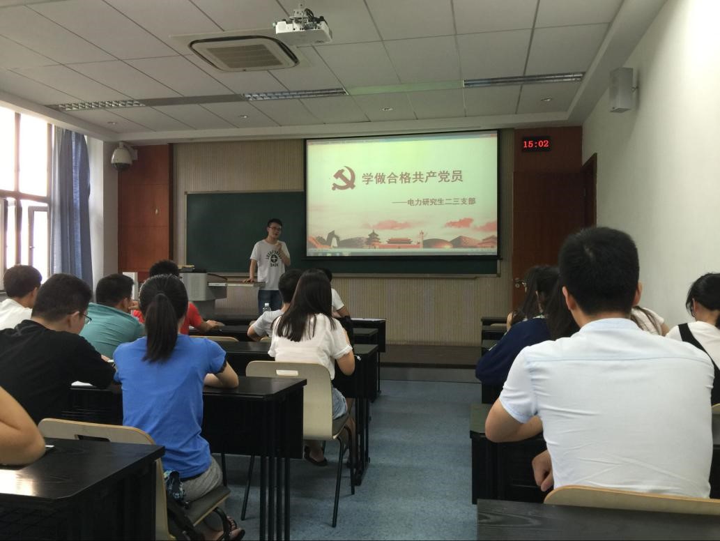电力系统及其自动化系硕士生第二、三支部于A8211教室开展了以“学做合格共产党员”为主题的党日活动。本次活动由三支部书记龙毅同志主持,二、三支部正式党员和预备党员积极参加了此次党日活动。