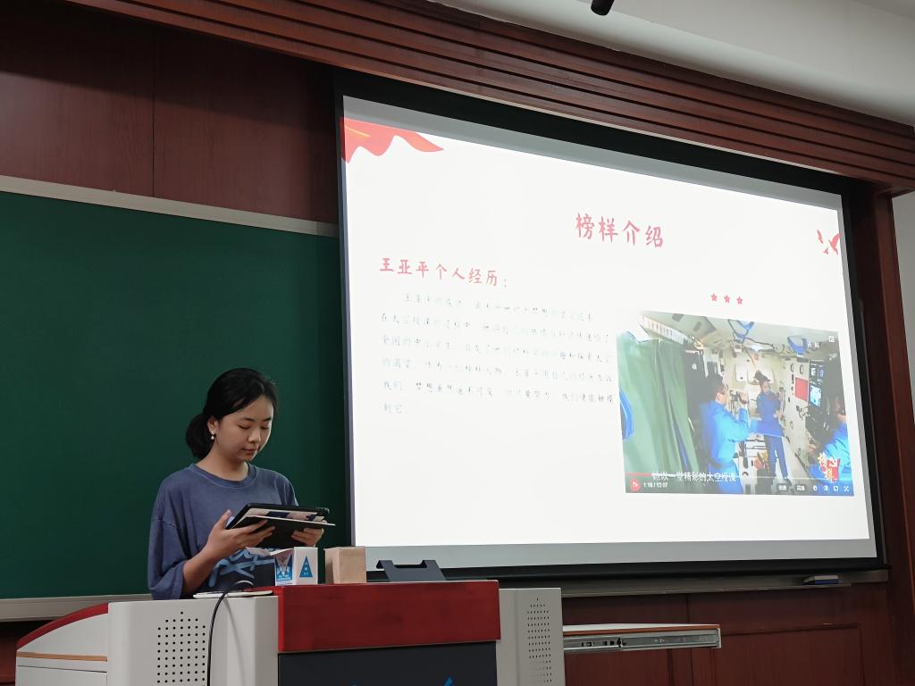 赵翰月同志带领大家回顾了王亚平同志的相关事迹,通过回顾王亚平同志出生平凡,却立下凌云梦想,坚持不懈,刻苦训练不言弃,最终成为实现首次太空行走的中国女航天员,完成多次飞行任务,成为家喻户晓的“最美太空教师”的奋斗历程,学习王亚平同志砥砺奋斗、敢于追梦、真抓实干精神。