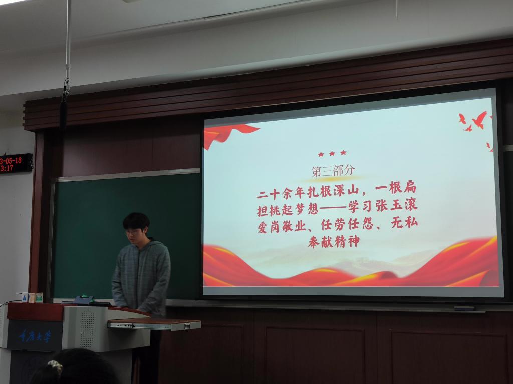 舒梽卿同志带领大家学习“全国优秀共产党员”张玉滚同志的相关事迹,通过回顾张玉滚同志坚守初心,投身乡村教育事业,关爱学生,精心呵护大山的孩子们,上好每一堂课,帮助一批批学生走出大山,让他们能够通过知识改变命运的事迹,从张玉滚身上,我们看到了理想信念的力量,领会到了张玉滚同志爱岗敬业、任劳任怨、无私奉献精神。
