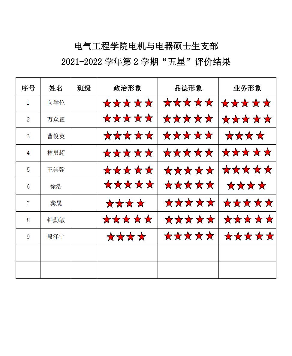 蜜桃直播 电机支部2021-2022学年第二学期“五星评价结果”