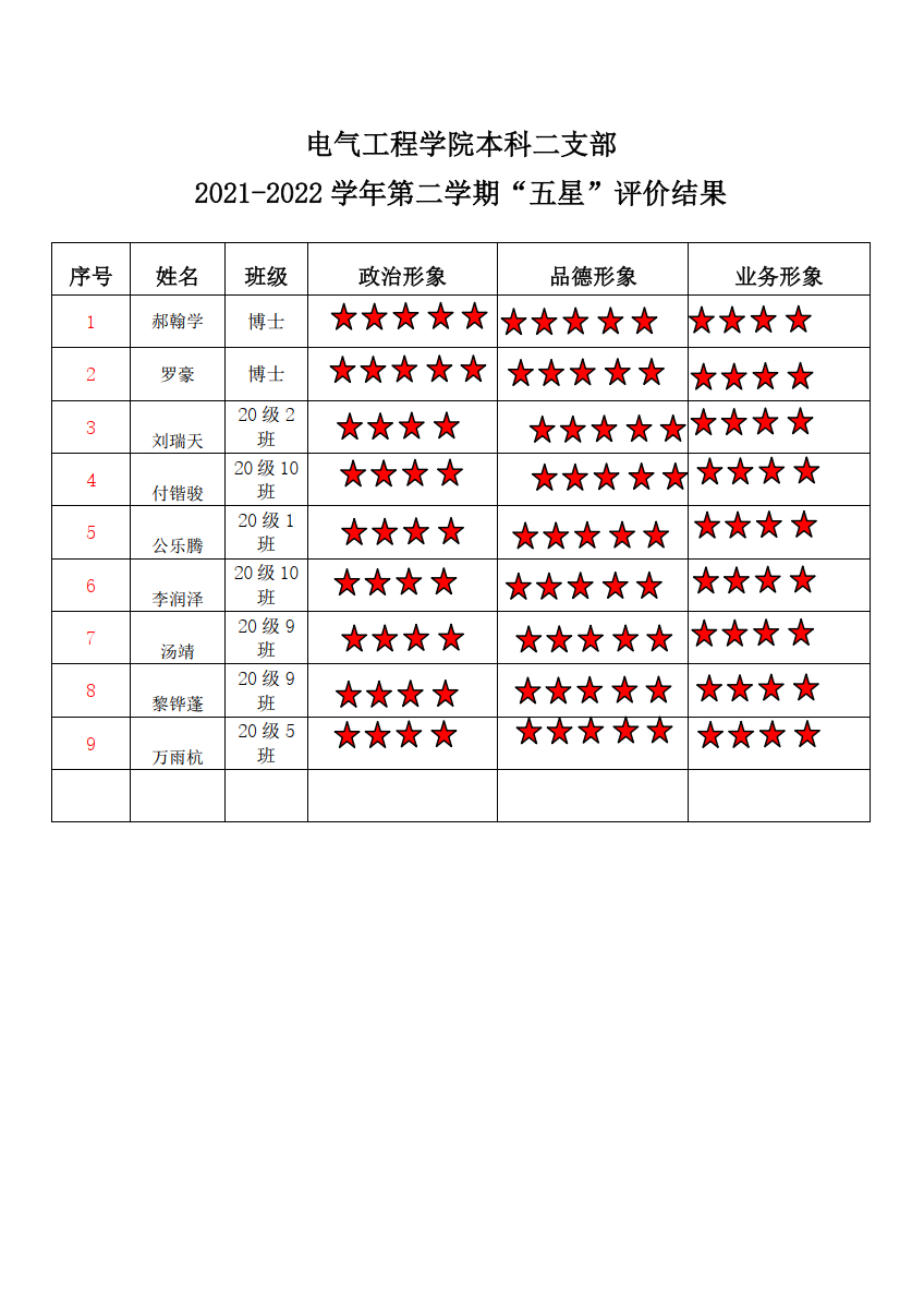 蜜桃直播 本科生四支部2021-2022学年第2学期“五星”评价结果
