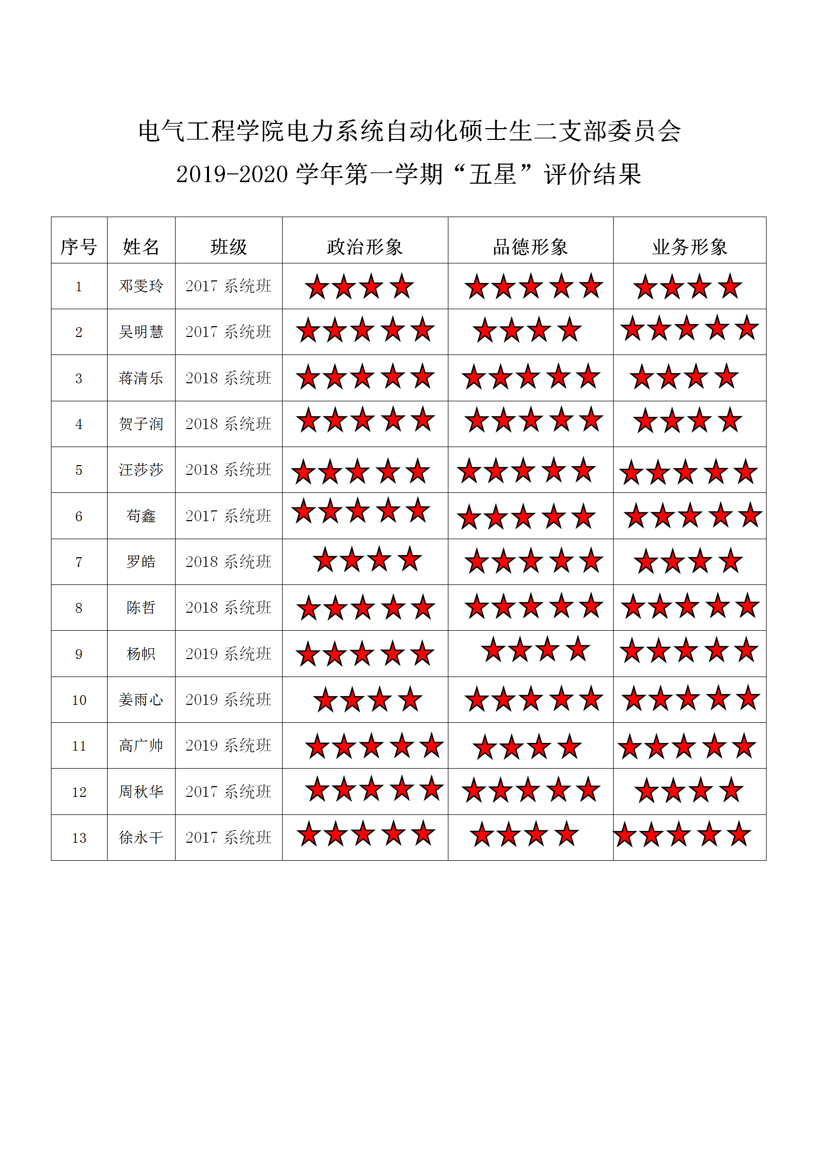 蜜桃直播 电力系统及其自动化系硕士生第二支部 2019-2020学年第1学期“五星”评价结果