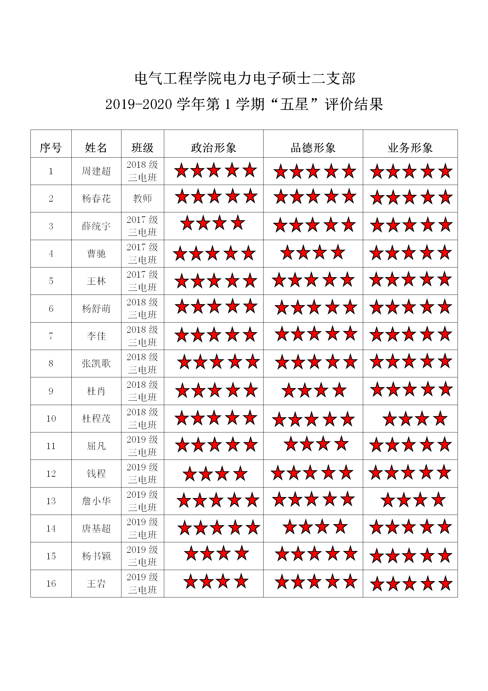 蜜桃直播 电力电子系硕士第二支部 2019-2020学年第1学期“五星”评价结果