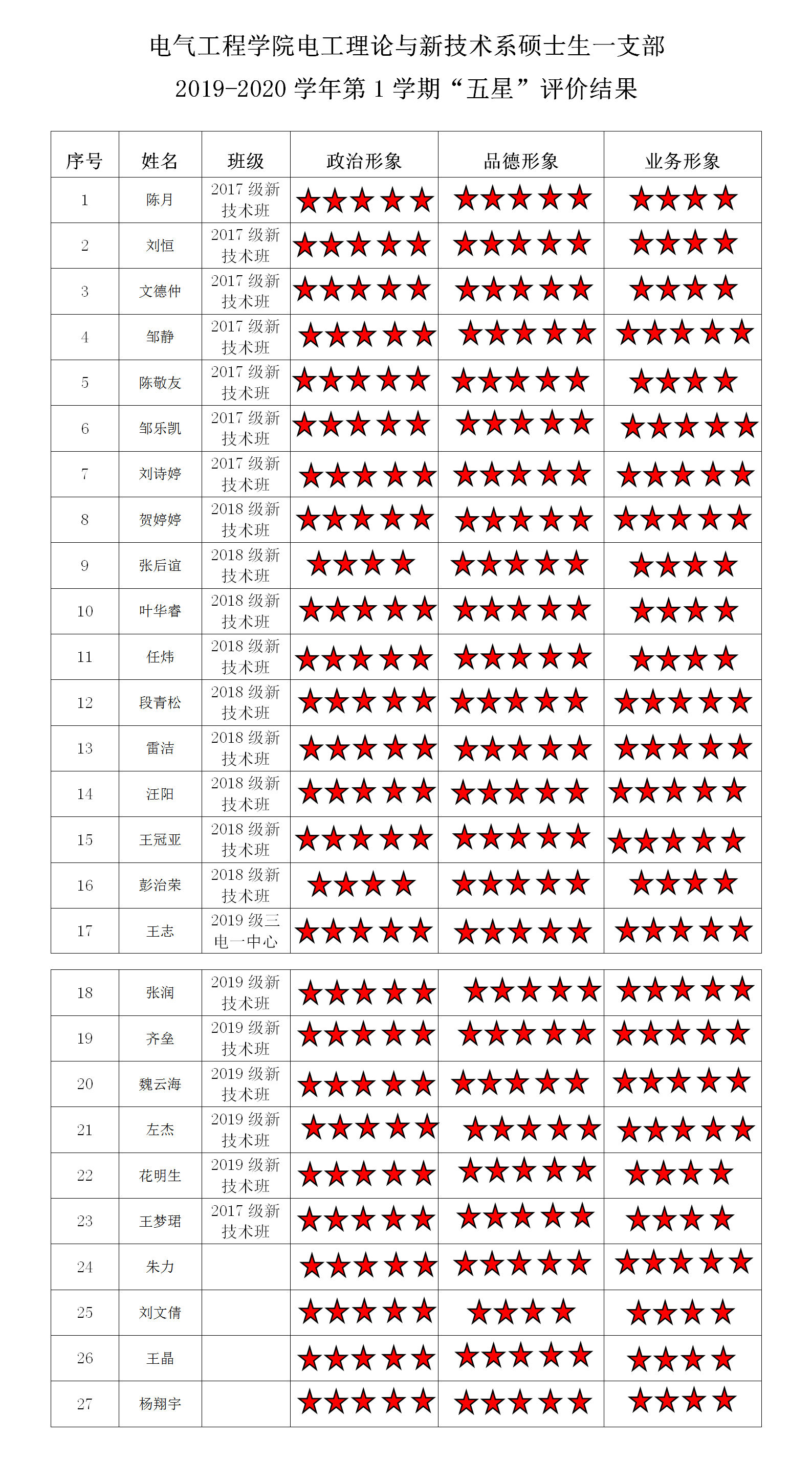 蜜桃直播 电工理论与新技术系第一支部 2019-2020学年第1学期“五星”评价结果