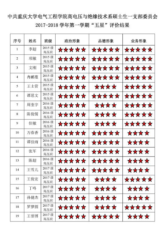 中共蜜桃直播-探花直播-色播 高电压与绝缘技术系硕士生四支部委员会 2017-2018学年第一学期“五星”评价结果