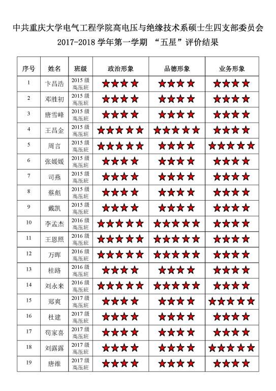中共蜜桃直播-探花直播-色播 高电压与绝缘技术系硕士生三支部委员会 2017-2018学年第一学期“五星”评价结果