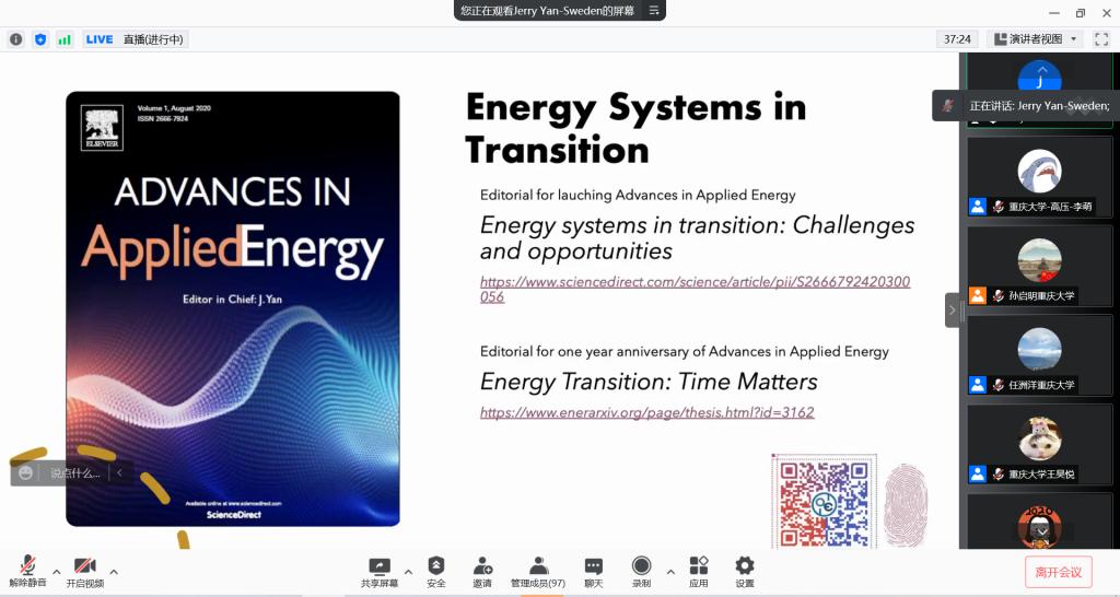 院士,Applied Energy主编严晋跃(Jerry Yan)教授受邀做客“成渝地区双城经济圈智慧能源大讲坛”,担任讲坛第二期的主讲嘉宾,以“Transitions of Future Energy Systems Towards Carbon Neutrality”为主题开讲。“成渝地区双城经济圈智慧能源大讲坛”是贯彻落实成渝双城经济圈蜜桃直播-探花直播-色播发展战略,深化成渝两地教育资源合作共享的重要举措。讲坛由蜜桃直播