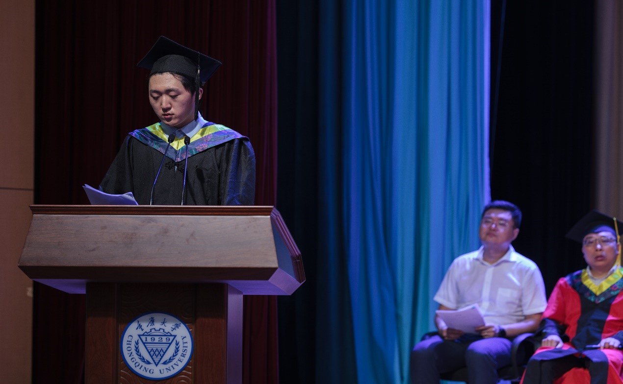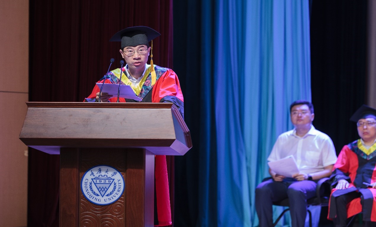 教师代表胡博老师致辞,在2021届重大电气学子即将展翅高飞之际,他谆谆教导毕业生们要踏踏实实做研究,立志明德,向优秀学习。胡博老师鼓励同学们抓住百年盛世的历史机遇,投入到中华民族伟大复兴的新征程中。