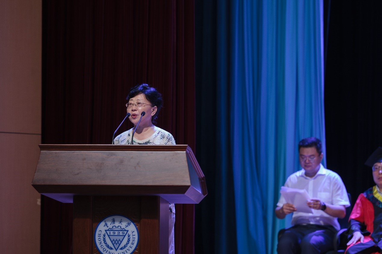 孙才新院士教育基金管理委员会主席吴绍琪教授致辞。她祝贺同学们结束了一个阶段的学习历程,顺利毕业并学业有成。她表示,建党百年,重任在肩,同学们要学习伟人精神、培养中华家国情怀,坚定民族自信心。吴绍琪教授、谢开贵书记为6名2021届毕业生代表赠送纪念品。