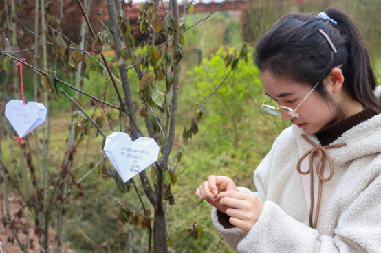 种植树苗后,志愿者们叠出心形、千纸鹤等折纸,写下自己对树苗、对祖国生态环境的美好祝愿。随后,志愿者们把这些爱的寄语挂在了自己亲手种植的树苗上,祈盼它们能够茁壮成长,荫蔽后人。基地负责人也会不定时把树苗的生长情况反馈给志愿者们。
