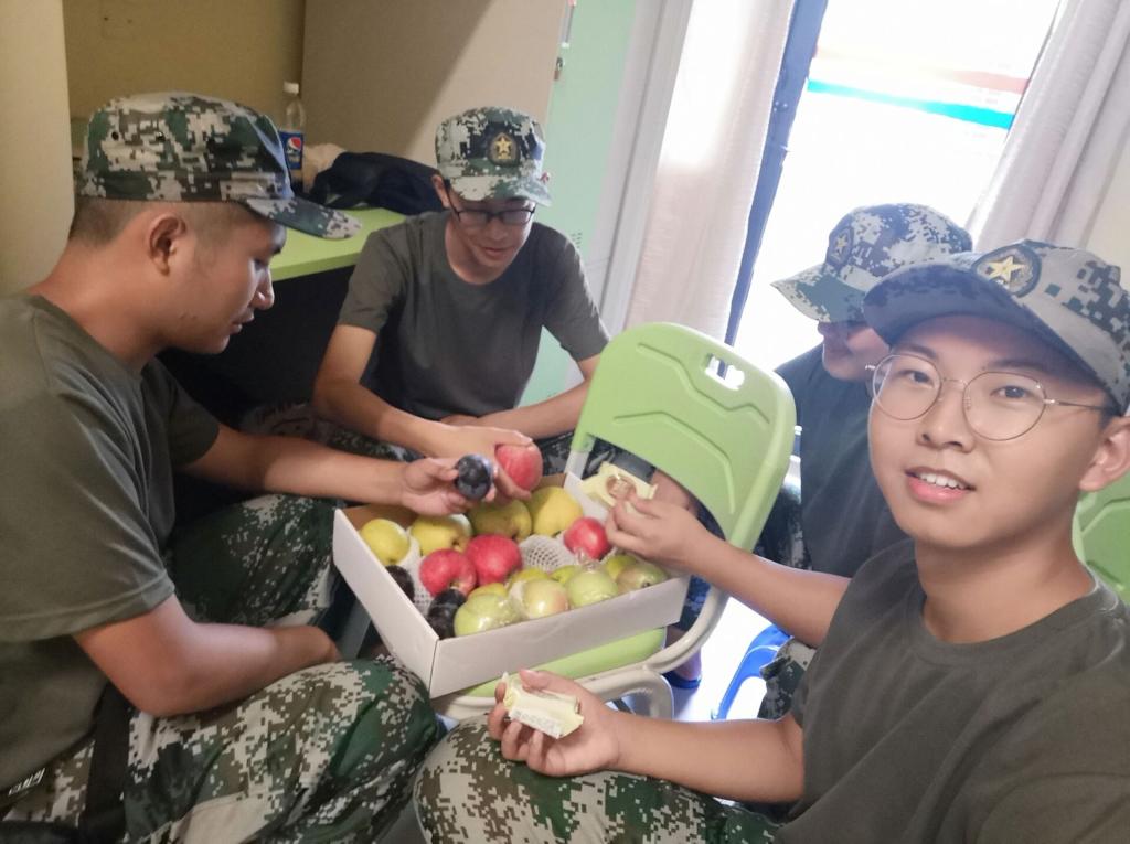 2019级辅导员罗敏等老师在松园二栋楼底架空层看望并慰问了正在军训的蜜桃直播