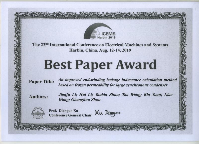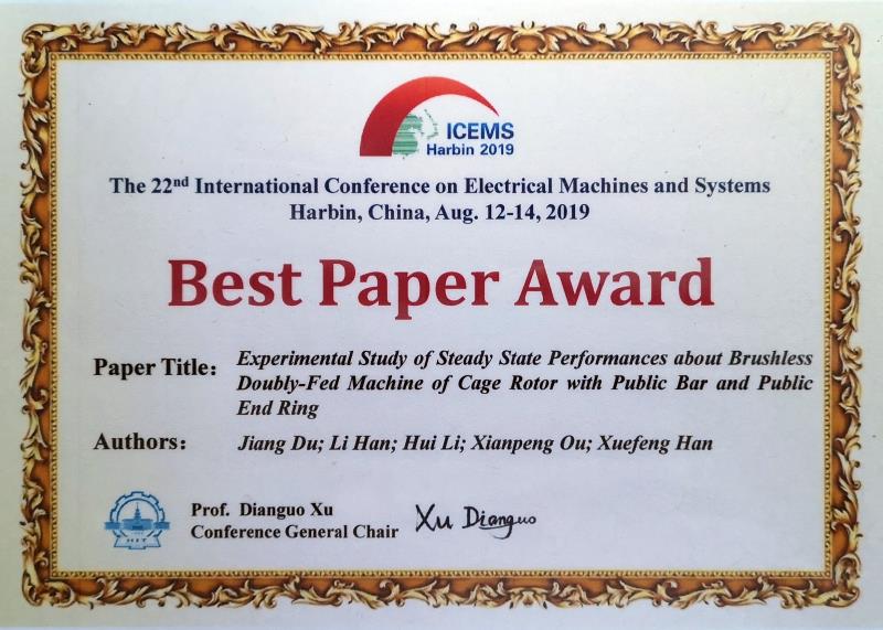 电机与电器系参会人员在本次会议上共发表15篇论文。其中,李辉老师课题组题为“An Improved End-Winding Leakage Inductance Calculation Method Based on Frozen Permeability for Large Synchronous Condenser”和韩力老师课题组题为“Experimental Study of Steady State Performances about Brushless Doubly-Fed Machine of Cage Rotor with Public Bar and Public End Ring”的两篇论文受到了与会专家们的高度评价,荣获最佳论文奖(Best Paper Award)。