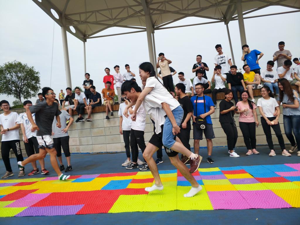 在富有趣味性的指压板迎面接力环节中,当参赛同学们跑到赛道尽头背起同班女生或者男生返回的时候,周围总是会响起助威声和笑声。最终,3班同学以38:94的成绩稳坐第一。