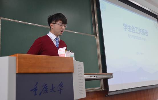 学生会工作,总结经验展望未来。他强调学生会的宗旨是“全心全意为同学服务”,初心是“维护学生权益”,接着从基础建设规范、助力学风建设、维护学生权益、加强寝室建设、推进职业发展和丰富校园文化这六个方面汇报了近两年来学生会的发展。黄方也同学为了让各位学生代表充分了解学生会近两年发展情况,列举出了“电工篮球赛”、“女生节”及“电气之悦”等一系列成功举办的校院活动,并且展示了学生会近两年获得的奖项荣誉。