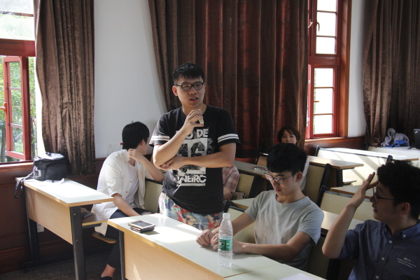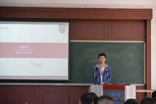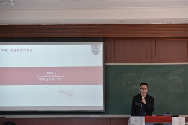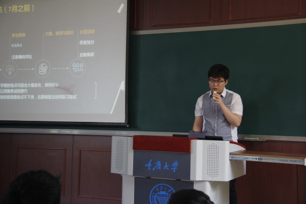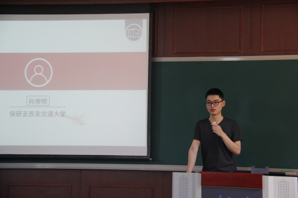 的王汉卿同学进行发言,他提醒有意向保研的同学要在暑假及时复习专业课以应付复试,并且要及时关注学科前沿问题并且联系实际进行思考。除此之外要及时联系导师并且制作简历。