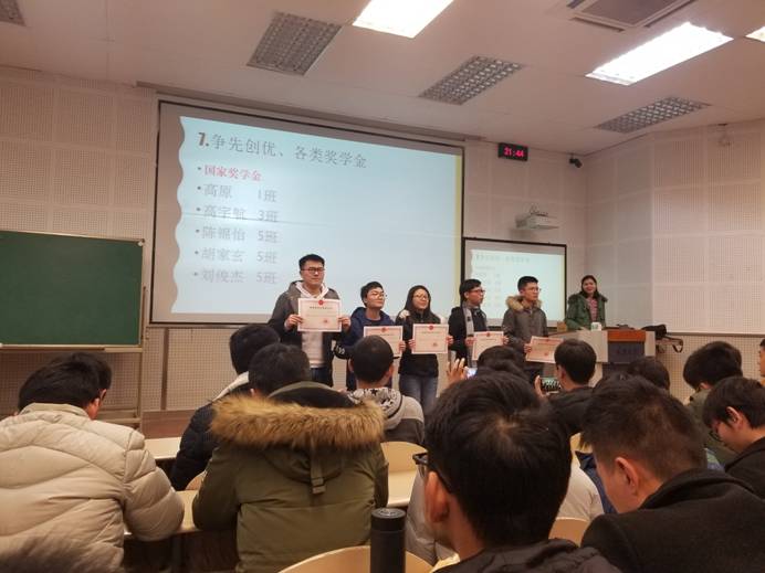 大会第二项议程,由喻老师对班级及个人所获奖项进行了公示及表彰。其中4班表现极佳,斩获校级、院级多个集体荣誉奖项。之后,喻老师对个人获奖情况也进行了表彰,其中陈锦怡等5名同学获得蜜桃直播-探花直播-色播奖学金,王兵凯等14位同学获得蜜桃直播-探花直播-色播励志奖学金,张奔等同学获得校级及院级争先创优的荣誉。