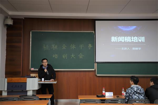 本次干事培训大会伊始,14级陈映宇学长从介绍新闻稿的结构入手,详细讲解了新闻稿写作的语言,手法以及其他的注意事项。其中陈映宇学长重点强调了新闻稿的写作应该主次分明,详略得当,注重活动现场的氛围描写。同时陈映宇学长在讲解过程中还通过列举正反事例进行对比,其中一些反面事例的错误也引得干事们哈哈大笑,既活跃了大会的气氛,也加深了干事们的印象,使干事们今后能够避免类似的错误。