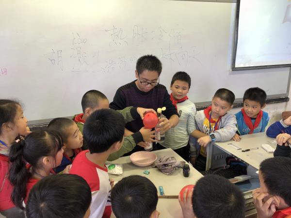随后,志愿者为孩子们做了“会吸气球的杯子”的实验。他首先提出问题:“你会用一个小杯子轻轻倒扣在气球球面上,然后把气球吸起来吗?” 孩子们纷纷感到好奇。志愿者将吹好的气球绑好,然后将热水倒入杯中,热水在杯中停留20秒后,把水倒出来,并立即将杯口紧密地倒扣在气球上,最终在孩子们的惊叹声中轻轻把杯子连同气球一块提起。志愿者讲述了原理:用热水处理过的杯子,因为杯子内的空气渐渐冷却,压力变小,因此可以把气球吸起来。接下来进行的实验是“烛火熄灭了”,志愿者将点燃的蜡烛在碗的中央滴上几滴蜡油,将蜡烛固定在碗中,并将苏打粉放在蜡烛的四周,倒一些食用醋于碗中,最终蜡烛熄灭了。孩子们非常感兴趣,纷纷举手做起了实验,最终他们学习到食用醋加上小苏打时,会产生二氧化碳气体,并且二氧化碳具有阻燃作用的原理。另一个实验是“神奇巫师的特饮”,志愿者运用了有色墨水,与上一个实验相结合,在飞舞的有色气泡的伴随下为孩子们多角度的解释了食用醋加上小苏打时,会产生二氧化碳气体的原理。