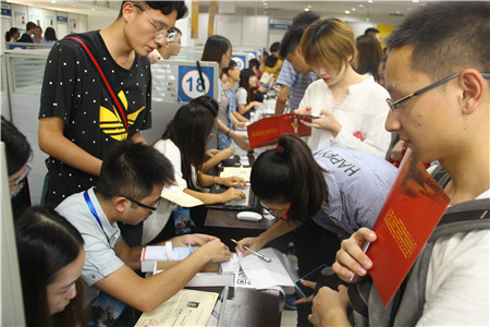 研究生分团委分会的工作人员井然有序的进行着新生报到注册工作。新生们只需交上通知书并签字,即可领取研究生校园卡,再进入下一个报道环节。