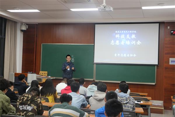 虎溪校区第一教学楼D1149面向15、16级科技支教志愿者举行了科技支教志愿者培训会。电气青协执行副主席孙东昱、执行副主席助理王骆、志愿者指导中心部长陈伟、部长助理徐皓枫出席本次培训会。