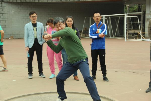 教青女子铅球比赛中,张谦老师拿球,转身,投球。一系列动作一气呵成,流畅无比。三次掷球,一次比一次精彩,一次比一次令人期待,巾帼不让须眉。