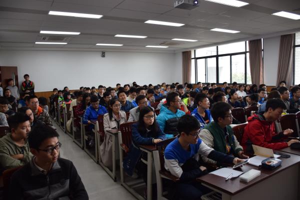 之后,便是对单片机入门的具体讲解。讲解之前,他播放了一个关于单片机前沿科技成果的视频,同学们眼中放出了光彩,纷纷摩拳擦掌想要一探究竟。杨鸿诚以51单片机开发板的介绍和C++学习网站的分享引入到单片机入门的具体探索方法。从硬件设计、软件设计以及机械结构的各方面介绍,来让大家对于单片机的学习方法打好坚实的框架,也为同学们指明了学习电子设计的方向,以让同学们少走弯路。然后,便是进阶之路部分。51单片机的功能并不能满足更高级的电子设计爱好者的要求,杨鸿城为水平较高的同学介绍了更高级STM32单片机的学习方法,并给这些同学提指点迷津,以不断冲击更高的水平。在最后的答疑环节中,更有好学的同学一直追问,对于电子设计的热爱溢于言表。