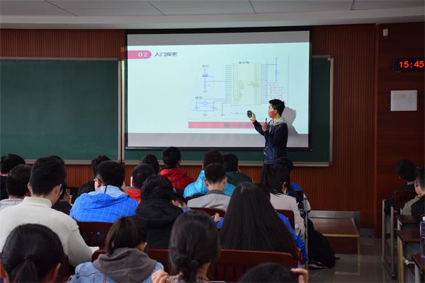 2014级10班的杨鸿城同学为大家讲解了有关单片机的基础知识,同学们满怀对电子设计的热情前来学习。