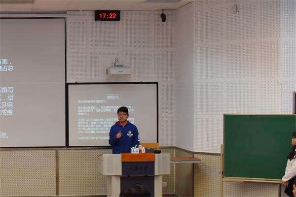 的研究生程章格结合自身经历,经由生动诙谐的语言,把自己经由电子设计的斑斓履历娓娓道来。用其可圈可点的真实人生经历勉励各位参赛者珍惜机会,把握资源,以本次电工电子技能竞赛为契机,学习相关知识,锻炼自身能力,完成自我的不断挑战和蜕变。同时,程章格将其各项新奇精巧的电子设计作品和曾在方程式赛车队间大放异彩的成果以照片和视频的形式在现场与各位参赛者分享,获得了在座同学们的赞叹之余,也激发了同学们对本次大赛的热情。在发言的最后,程章格从队友、硬件、软件、平台、比赛准备五方面传经送宝,将竞赛经验倾囊相赠,更将科研精魂薪火相传。