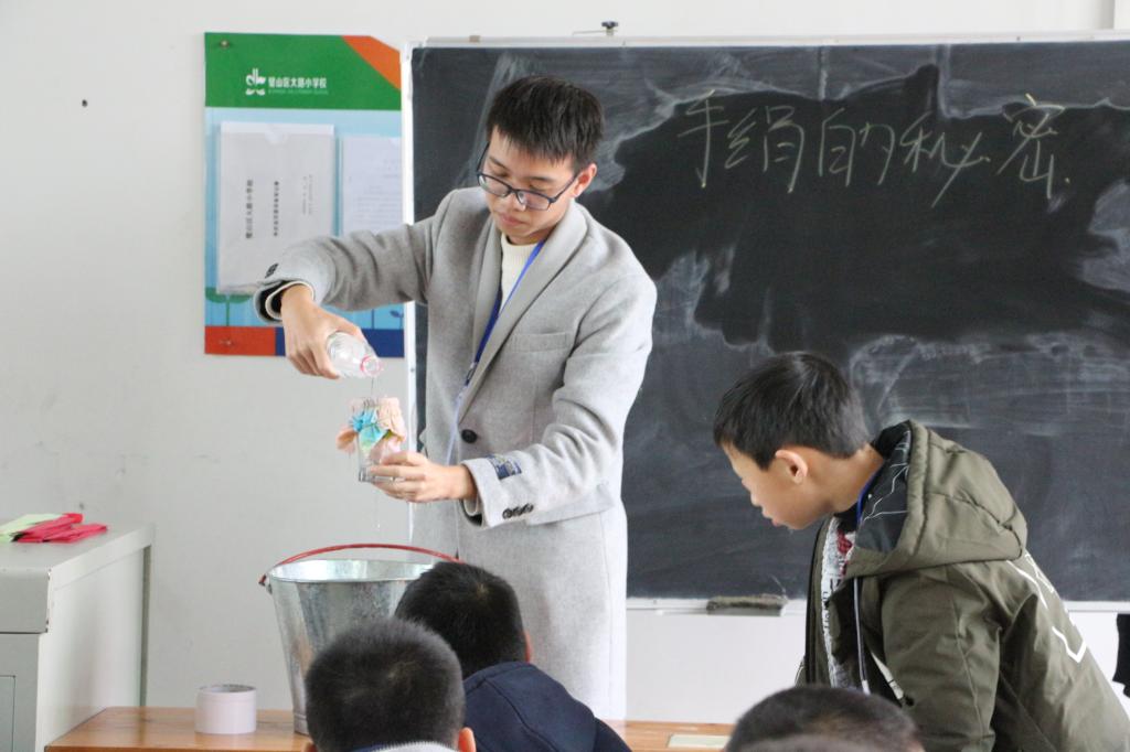 的志愿者们在电气青协干部孙东昱、陈伟和干事管渝、王文兵的带领下再次来到璧山大路小学,为孩子们带来了与惯性、液体表面张力和流体压强相关的数个小实验和一个互动大实验。