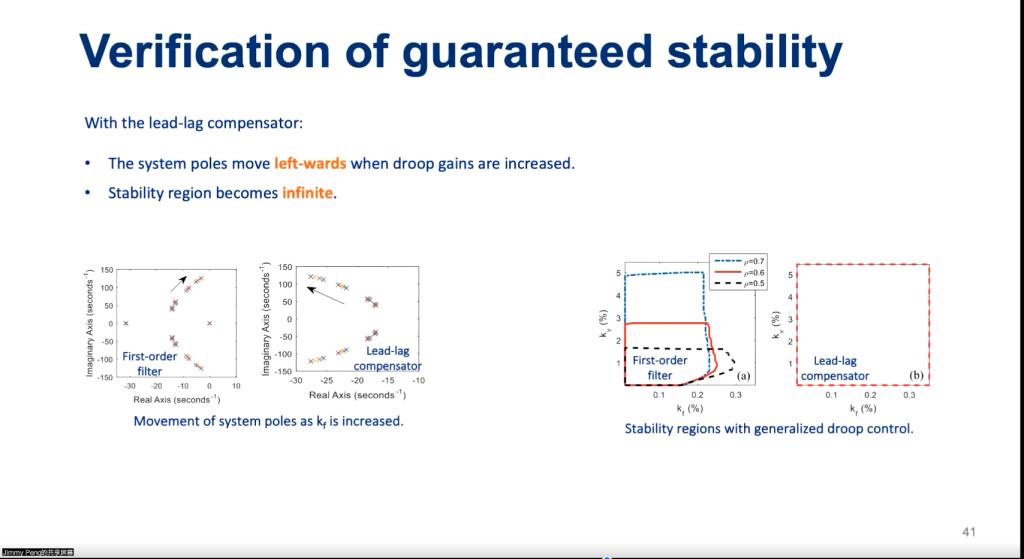 随后,Jimmy Peng通过建立小信号模型、机械模型、AC网格模型推导矩阵公式,详细分析在下垂控制下AC网格的稳定性。紧接着,Jimmy Peng从下垂控制的两大难点出发,通过设计广义下垂控制和超前滞后补偿器保证下垂控制逆变器的稳定性。