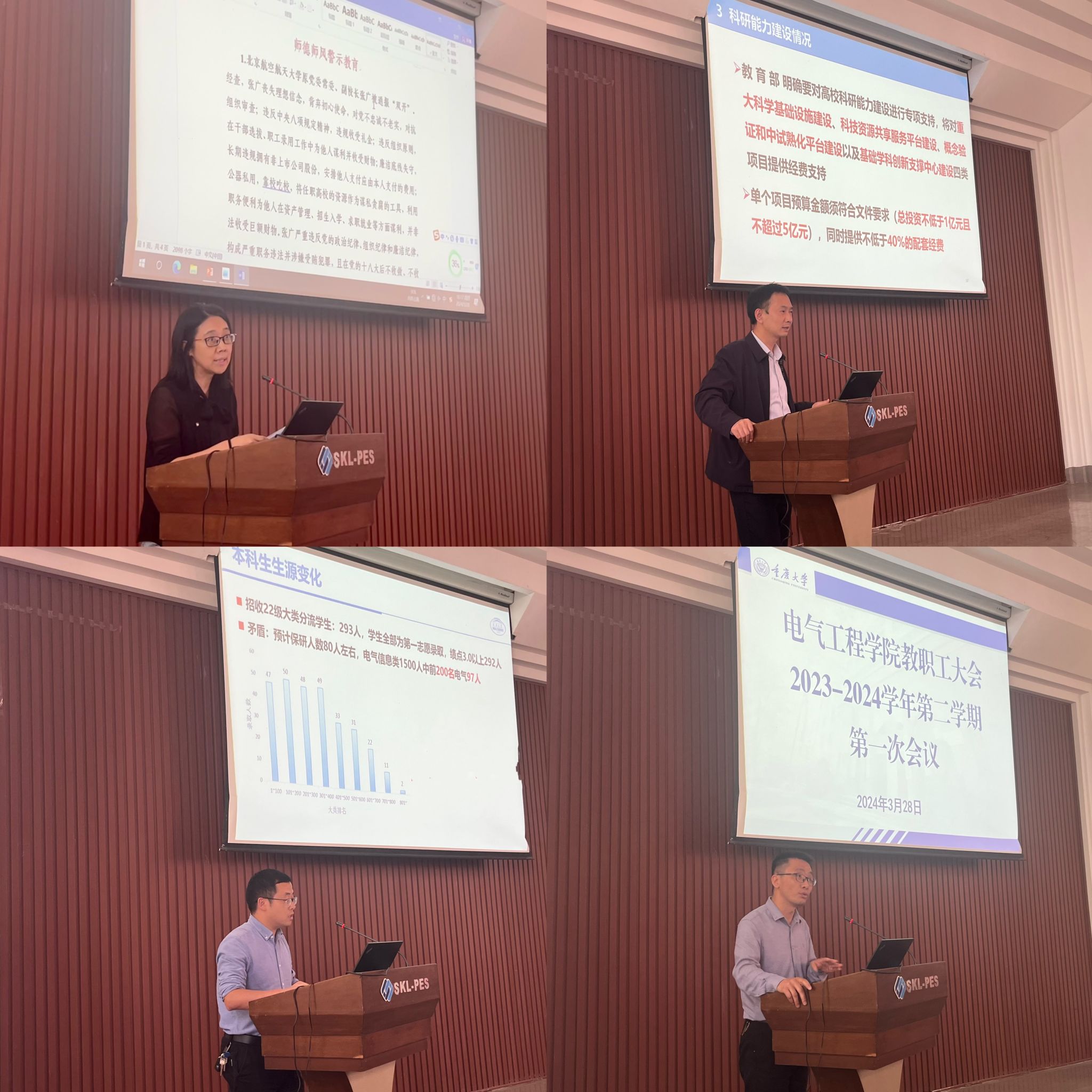 2023年绩效总体发放原则和具体发放情况;杜雄就2024年蜜桃直播-探花直播-色播和重庆市自然科学基金申报情况、科研能力建设、学科建设经费分配初步方案等进行了简要通报。杨鸣从本科教学规范、研究生过程管理等方面再次强调了教学纪律、培养要求和导师职责的重要性。曾礼强简要通报了蜜桃直播
