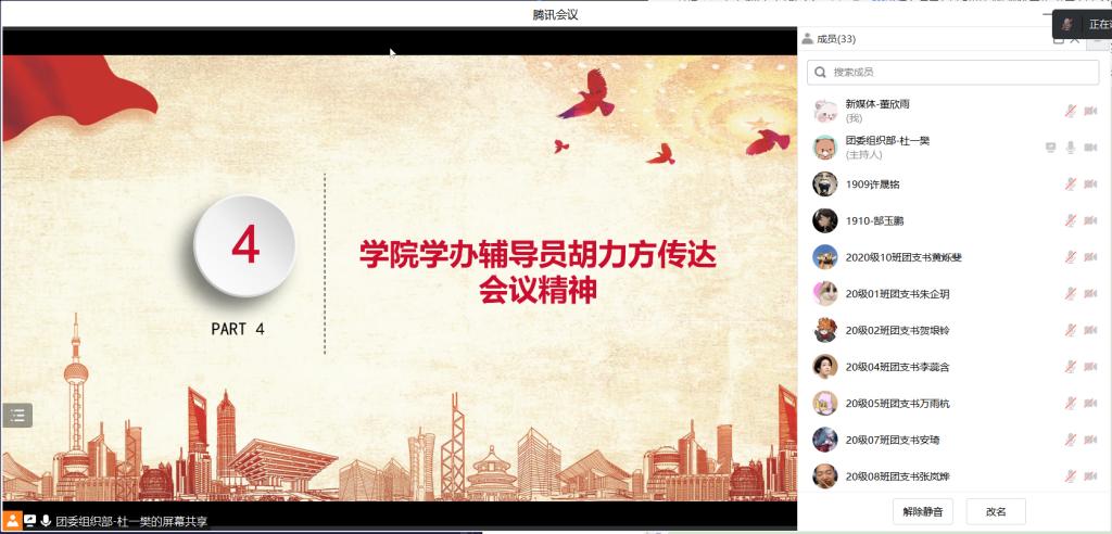 2020级辅导员胡力方、2019级优秀团支书许晟铭,19级、20级、21级全体团支书参加会议。主持人杜一樊宣布大会开始并介绍与会嘉宾。