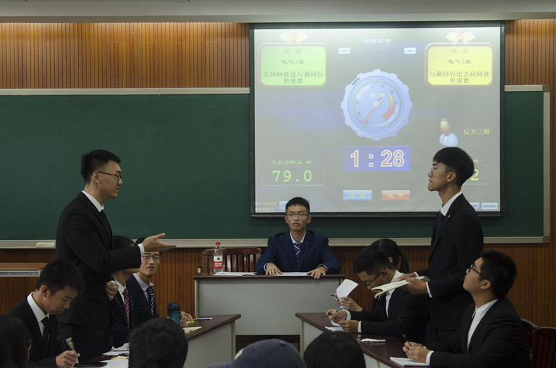 2019级新生辩论赛半决赛于D1320和D1321正式打响。经过前两轮的角逐,共有四班、五班、八班和十班四个班级进入半决赛。此次辩论赛半决赛,各班辩手以“与谁同行和去向何处的重要性”为论题,展开激烈而精彩的辩论。